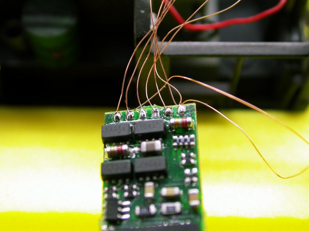 Tja, wenn man sich die Bilder ansieht, es bedarf schon viel fototechnischer Einstellungen, wie auf Bild 5, das man mal was von der Elektronik sieht. Auch durch die Rückfenster spitzt etwas Elektronik. Ansonsten ist der kleinste Sounddecoder SL74 kaum zu sehen und unser kleiner eckiger Minilautsprecher versteckt sich perfekt im Dach und macht aber Sound in seiner höchsten Qualität. Schön, das bei diesem Modell schon Lichter eingebaut waren, die mussten wir nur korrekt verkabeln und das reduziert natürlich den Aufwand gegenüber unserer Köf um ein Vielfaches. Wichtig die löttechnische Schnittstelle, die wir an der Motorrückwand angebracht haben, damit die Welt der Kabel, die wir unangetastet liessen und unsere neue Welt der Kupferlackdrähte gut zusammen gingen. Das der Decoder mit Kupferlackdrähten verlötet ist, ist in solchen Situationen unerläßlich. Schon an den Bildern 15 und 16 sieht man, das bei sauberer Verkabelung das ganze gar nicht so viel aussieht, wie es eigentlich ist. Die Arbeit steckt in der perfekten Verkabelung.